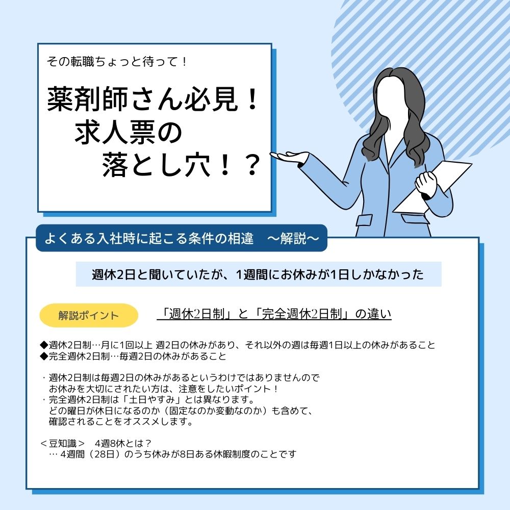 転職活動を行うなかで、面接を受けるか受けないか意思決定の判断材料となるのが「求人票」です。勤務時間や給与、休日など、様々な情報の記載がありますがこの求人票には様々な記載の項目やルールが存在します。例えば…週休2日と完全週休2日。正確な違いをご存知でしょうか?このように、求人票に記載がある項目の正しい意味を理解しないと「転職後にこんなはずではなかった…」となってしまう可能性も。年々厳しさを増す、薬剤師転職マーケットだからこそ、後悔のない転職活動を行っていただきたいと感じています。また、正しく求人票を読み取ることができれば、転職後のライフスタイルのイメージが湧きやすい事もメリットです。